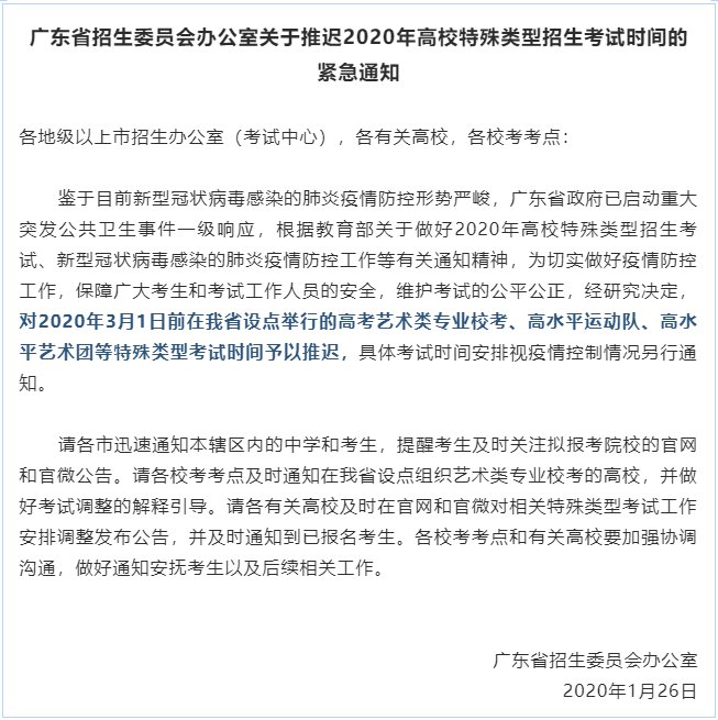 1月23日,教育部下发通知,强调近期各地各高校将举行的特殊类型招生考试、高职分类招生考试等一般应推迟进行。确须如期举办的,要在科学研判基础上,制定严格预案,合理调整考试方式等,并向同级疾病预防控制机构和上一级教育行政部门门报备。