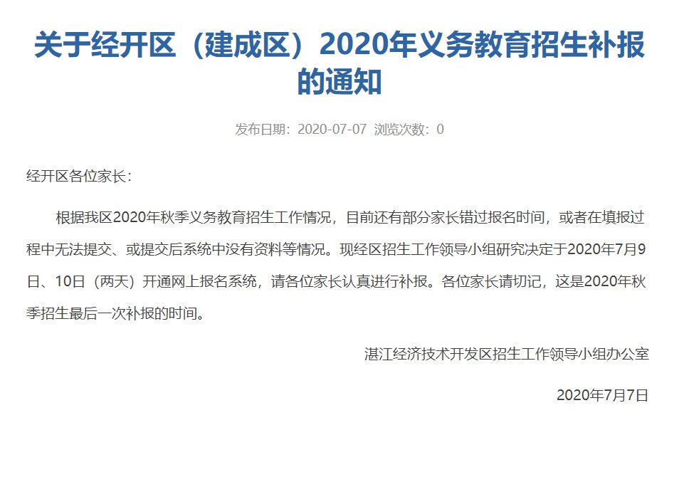 根据我区2020年秋季义务教育招生工作情况,目前还有部分家长错过报名时间,或者在填报过程中无法提交、或提交后系统中没有资料等情况。现经区招生工作领导小组研究决定于2020年7月9日、10日(两天)开通网上报名系统,请各位家长认真进行补报。各位家长请切记,这是2020年秋季招生最后一次补报的时间。