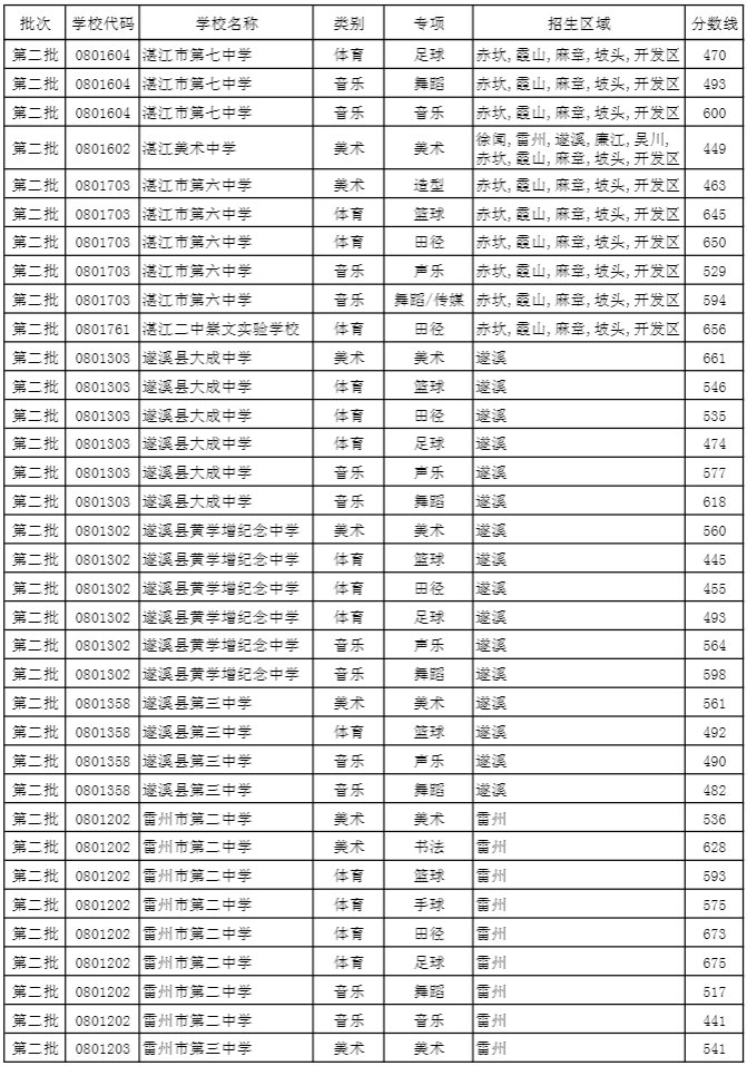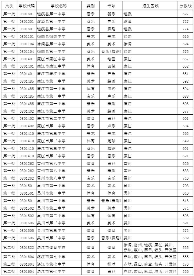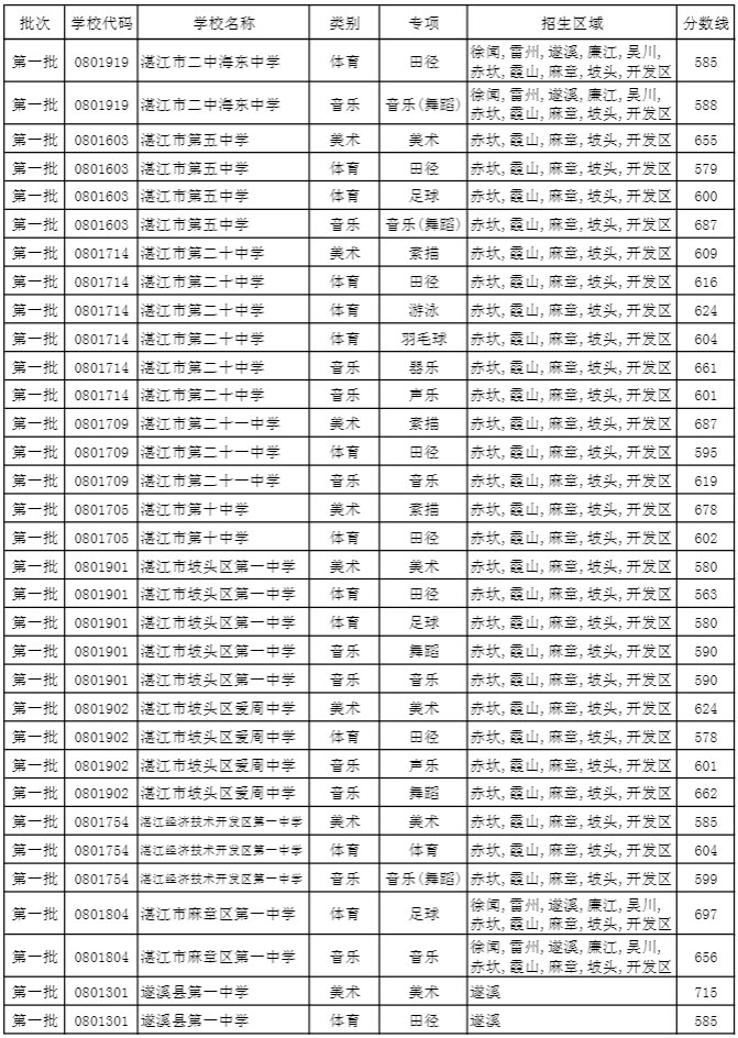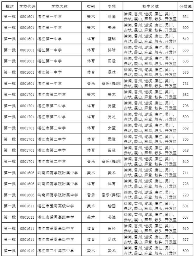 湛江市2019年普通高中学校特长生录取分数线: