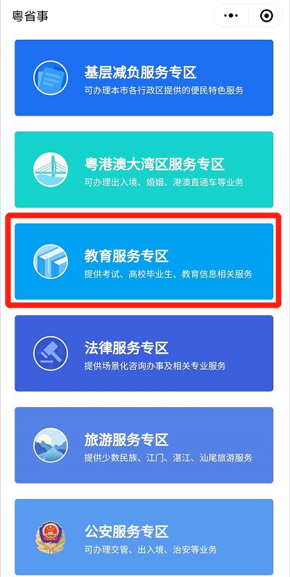 3.在微信搜索框输入“粤省事”,点击“搜一搜 粤省事”,进入“粤省事”小程序,点击“专区”板块,选择“教育服务专区”,再选择“高考”,点击“准考证查询及下载”,通过考生号和密码登录即可查看准考证或将其发送至考生指定邮箱进行存档打印。