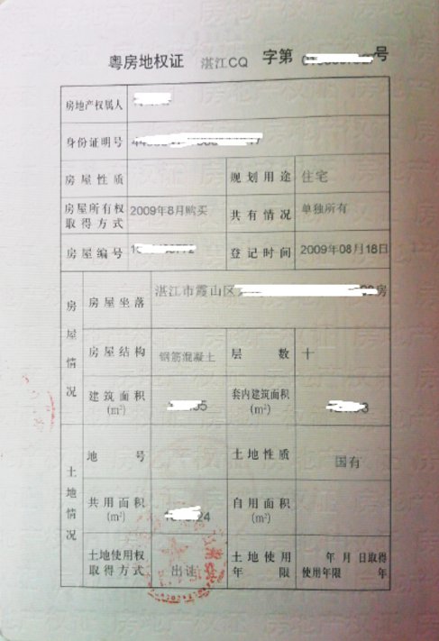 b、权证编号为“粤房地权证湛江CQ字第XXXXXXX号”,1页。