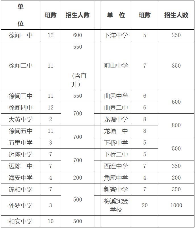 3.县城学区的徐闻一中、徐闻二中、徐闻三中同时面向城区小学招生。徐闻四中和徐闻五中在确保本乡镇招生区域毕业生全部入学的情况下,如有学位,可向城区小学招生。