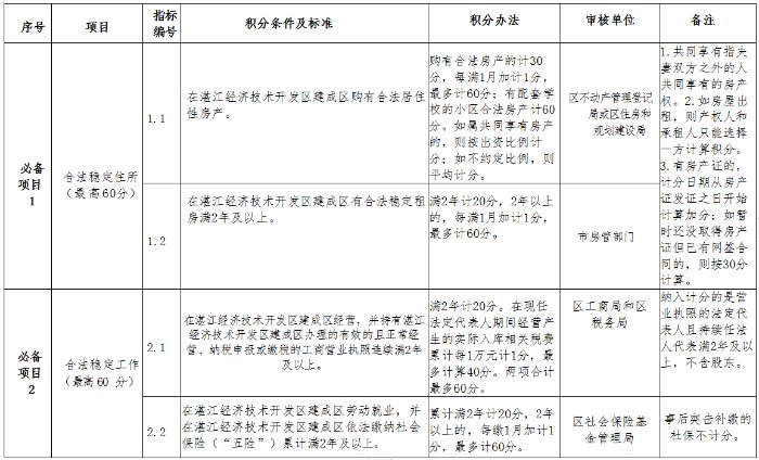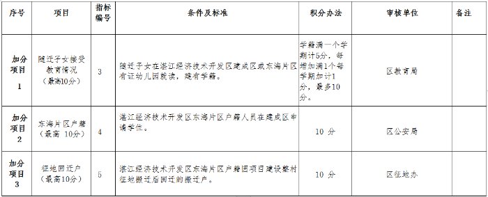 湛江经开区积分入学指标及分值表 湛江开发区小学积分