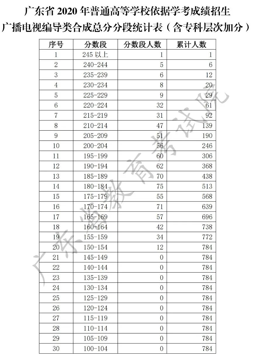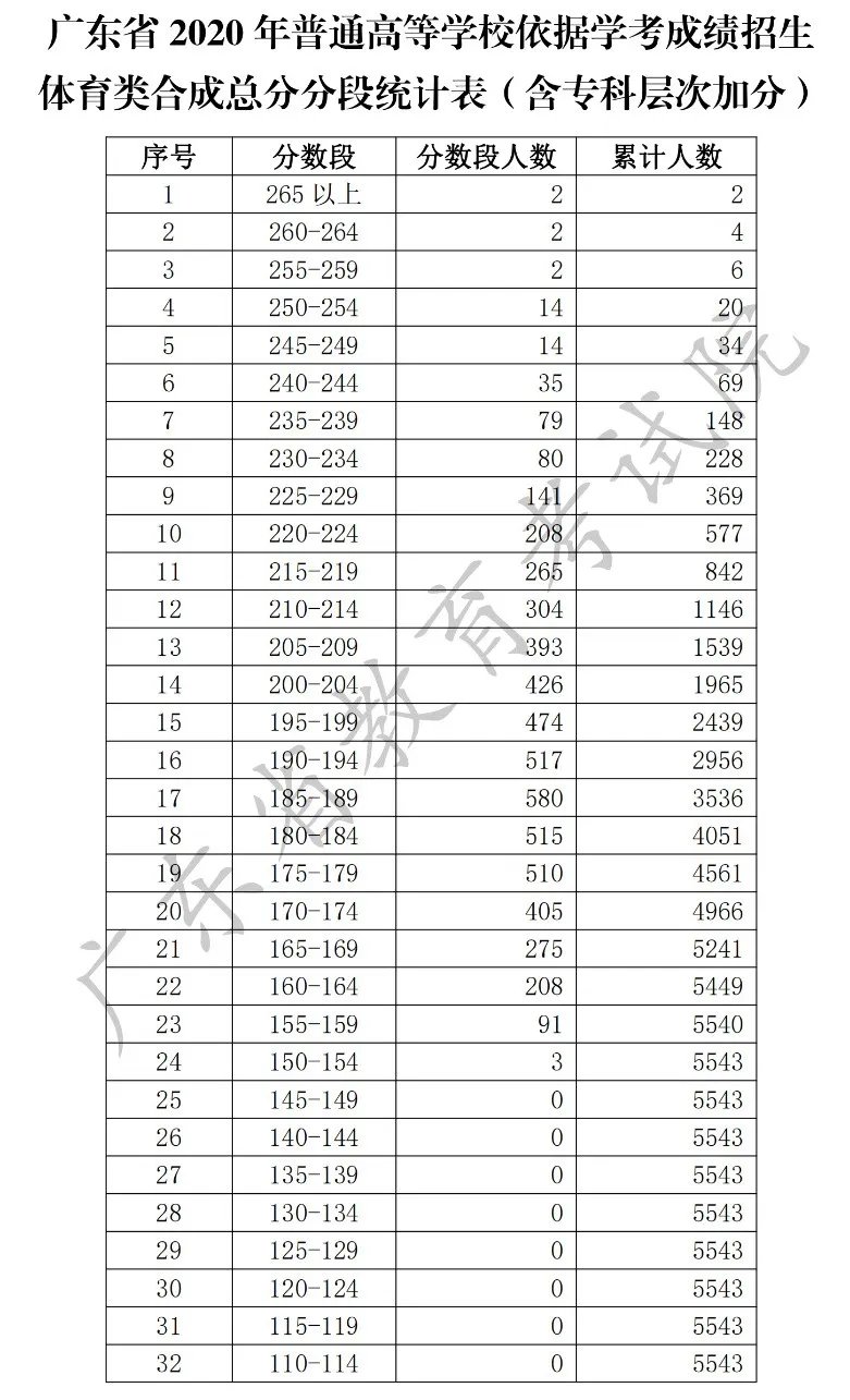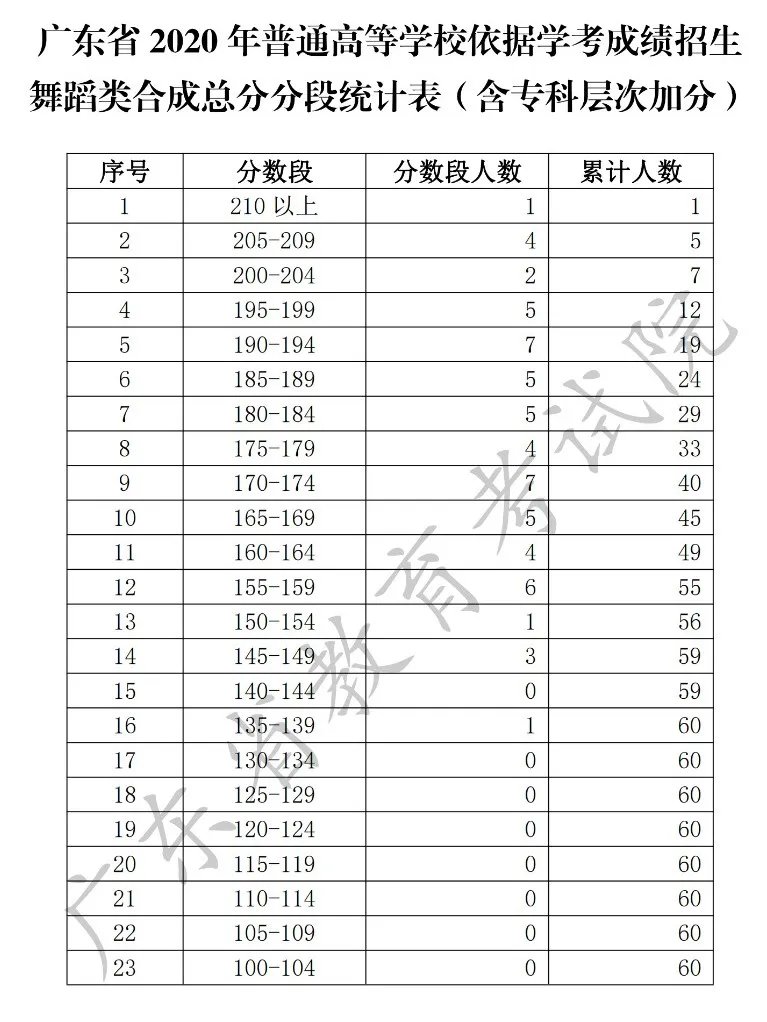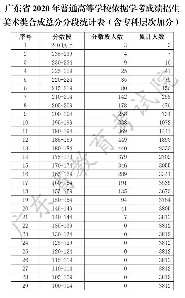 广东省教育考试院公布了2020年广东省普通高校春季高考分数段: