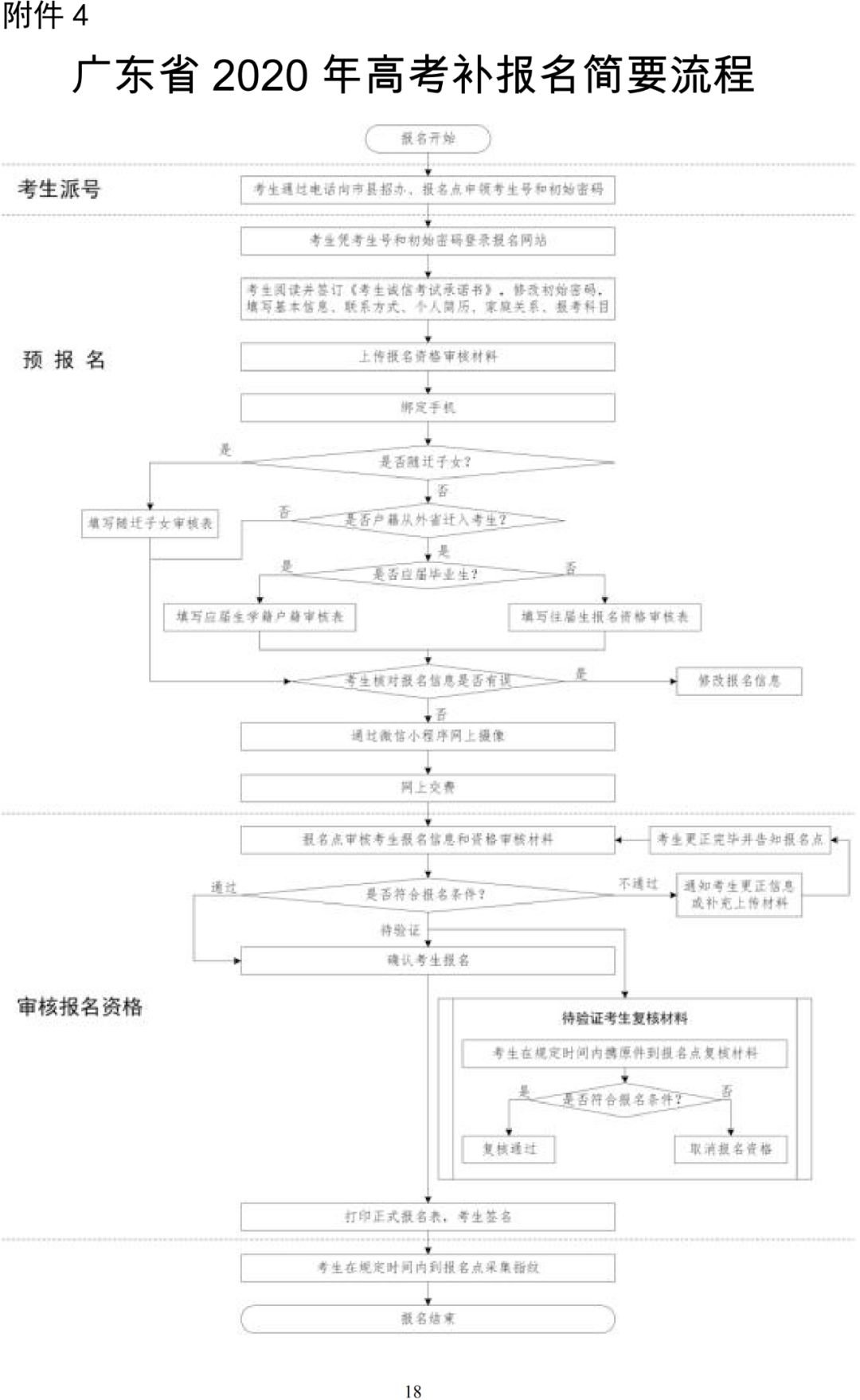 根据《关于做好广东省2020年普通高校招生统一考试报名工作的通知》(粤招〔2019〕13号)的要求,我省2020年普通高考报名工作于2019年11月1-10日进行,绝大部分符合报考条件的考生已完成报名。为满足退伍军人、运动训练及武术与民族传统体育考生、高职院校自主招生考生等符合我省高考条件,因各种原因尚未参加高考报名人员的需求,经研究决定安排一次高考补报名。根据国家和我省新冠肺炎疫情防控工作的部署和要求,为确保考生和考试工作人员的生命安全和身体健康,减少聚集,本次高考补报名采取先线上办理、后补验材料的方式进行。有关事宜通知如下: