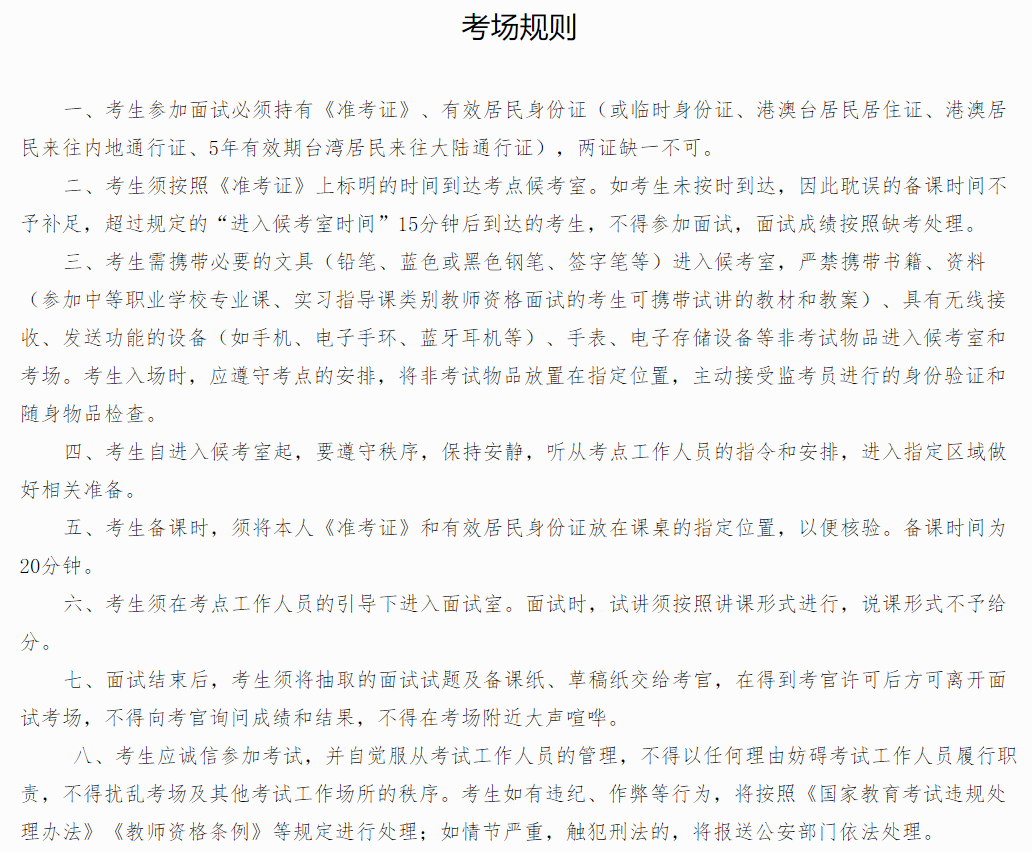 考生如不遵守考场规则,不服从考试工作人员管理,有违规行为的,将按照《国家教育考试违规处理办法》进行认定和处理。如考试违规行为被认定为作弊的,还将依据《教师资格条例》等一并进行处理。情节严重者,如在考试过程中有组织作弊、代替他人或者让他人代替自己参加考试等涉嫌违法犯罪行为的,将根据《中华人民共和国刑法修正案(九)》的规定,移送司法机关追究刑事责任。