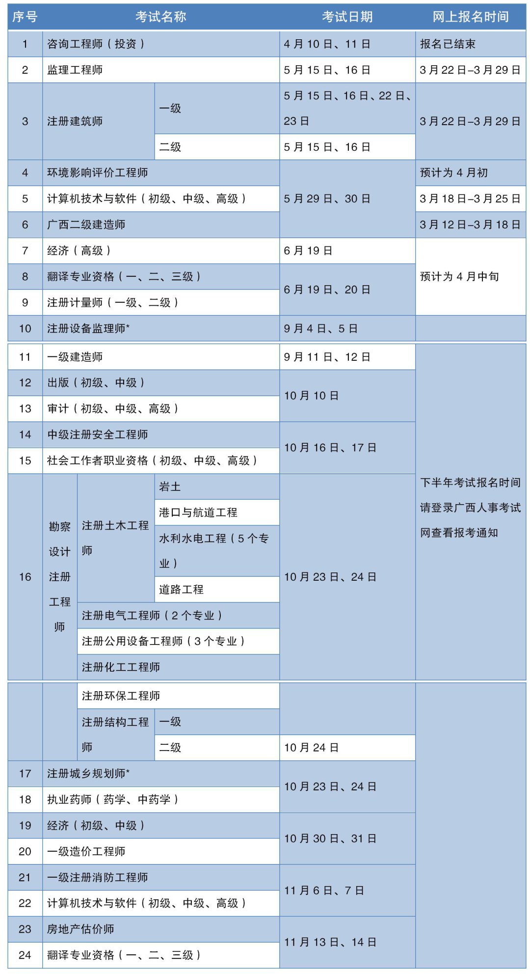 监理工程师和一、二级注册建筑师考试将于近日网上报名,其它暂未发布报考通知的考试(环境影响评价工程师、翻译专业资格、注册计量师)预计将于近期发布并开展报名工作,请各位报考考生及时登录广西人事考试网(www.gxpta.com.cn)查看最新的考试考务通知,以免耽误报名。