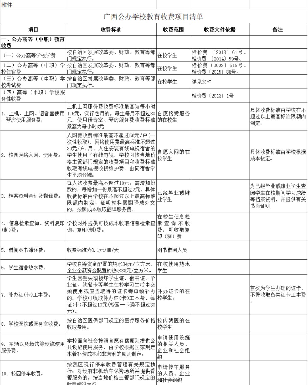 广西公办学校教育项目收费清单明确了公办高等(中职)教育收费、公办义务教育收费、公办高中教育收费、公办学前教育收费等四类的收费标准、收费范围、收费文件依据。具体来看,公办高等(中职)教育收费包括学费、住宿费、考试费、服务性收费、代收费。其中,服务性收费包括上机、上网、语音室使用、琴房使用服务费;校园网络入网、使用费;档案资料查证及翻译费;信息检索查询、资料复印(制)费;借阅图书滞还费;学生宿舍热水费;补办证(卡)工本费;学校医院或医务室收费;车辆以及场馆等设施使用服务费;校园停车收费;培训费。代收费则有教材费,军训服装费,公寓用品代收费,专业服装及用品费,超定额水电费,外语等级考试、计算机等级考试、普通话测试等各类考试报名费考试费,城乡居民基本医疗保险费,体检费以及其他费用(学校代学生办理居民身份证、迁移户口等服务)。