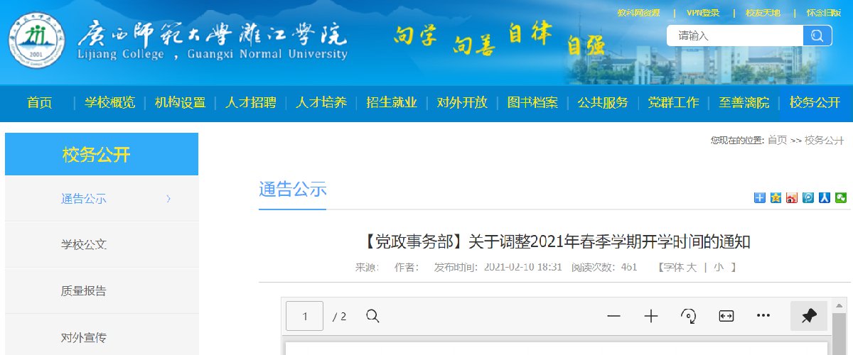 近日,广西师范大学漓江学院发布通知调整春季开学时间。
