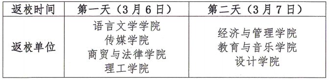 (一)学生由原计划2月27日开学、3月1日正式上课,调整为3月6日(星期六)、7日(星期日)报到注册,3月8日(星期一)正式上课。各二级学院学生实行错峰返校,具体安排如下: