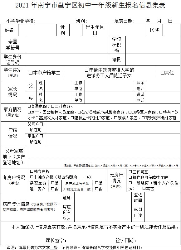 (四)2021年7月3日、7月4日(星期六、星期日)两天为城区初中一年级新生报名时间,新生报名时间为每天上午8:30至11:30,下午15:00至17:30;本市户籍新生可到家庭住址(房产登记的地址)所属的地段初中学校报名,填写《2021年南宁市邕宁区初中一年级新生报名信息采集表》(附件2-2);进城务工人员随迁子女到城区教育局指定的地点报名。(详见附件2-1)。