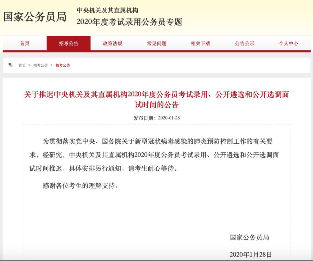 1月28日,国家公务员局发布《关于推迟中央机关及其直属机构2020年度公务员考试录用、公开遴选和公开选调面试时间的公告》。