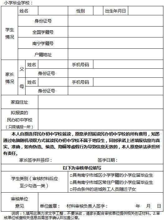 2021年秋季学期南宁市市区民办初中一年级招生报名信息采集表