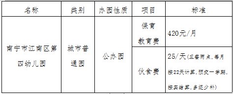按南发改委收费〔2020〕71号文件《南宁市发展和改革委员会 南宁市财政局 南宁市教育局关于调整我市公办园收费标准有关问题的通知》中保教费收费标准自2021年春季学期起执行。