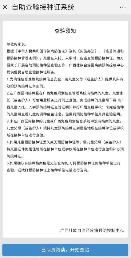 1.在广西区内打预防针,有预防接种证,未完成当前年龄国家免疫规划疫苗接种的儿童,可以利用微信查看儿童的漏种疫苗信息,但需前往预防接种单位开具查验证明。