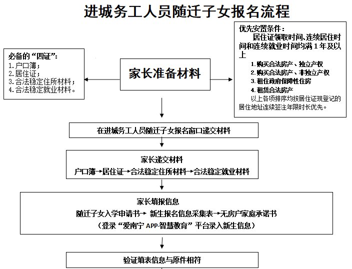 申请由政府安排入学的进城务工人员随迁子女,其父母须持有效的兴宁区各派出所核发的《广西壮族自治区居住证》(以下简称居住证),且在兴宁区有合法稳定住所、已合法稳定就业。居住证、合法稳定住所材料和合法稳定就业材料的持有人(签订人)须一致,且为申请就读随迁子女的父母或其他法定监护人。居住证登记居住地址应与其合法稳定住所地址一致。