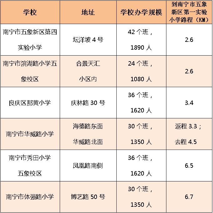 注:各学校安排本校招生地段内南宁市城区生源后,视尚有学位情况,统筹安排五象新区第一实验小学南宁市城区超量生源。