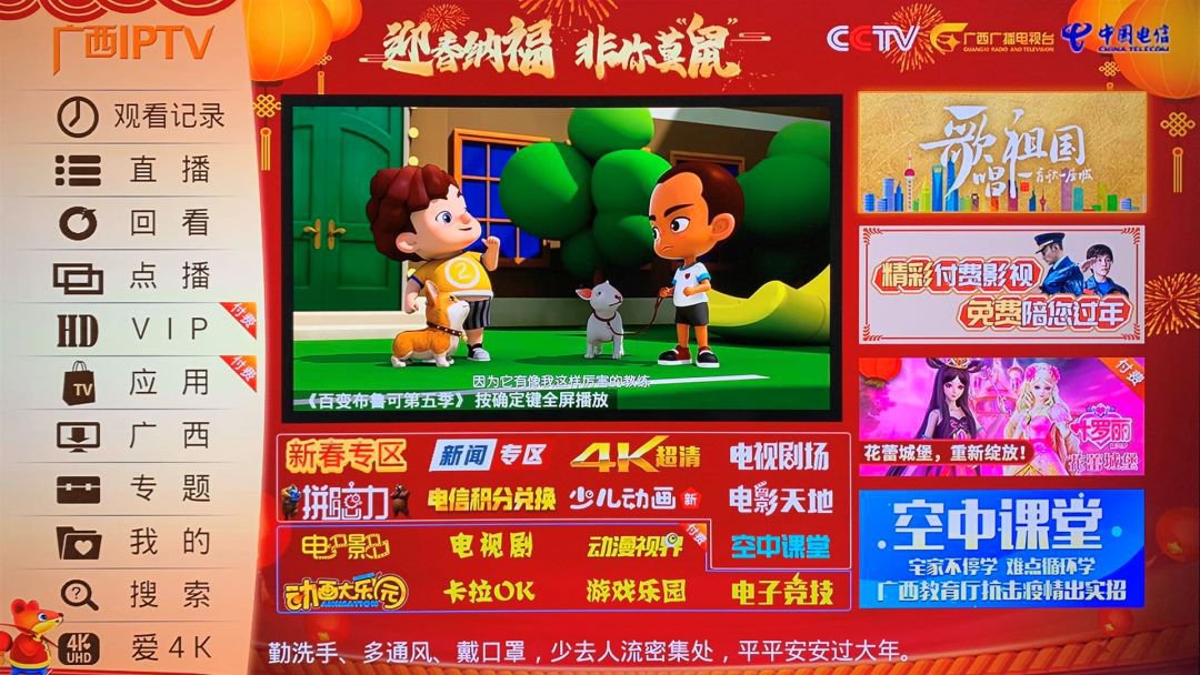 微信搜索并关注“广西电信”公众号,选择“我要办理”——“光纤电视”——“空中课堂”即可收看。