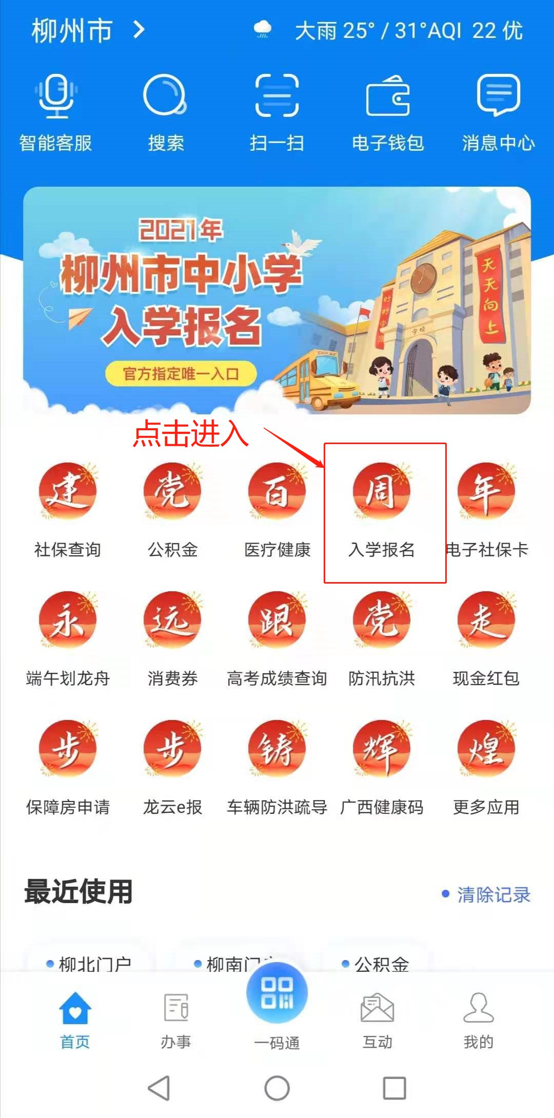 1.进行网上报名,进入“龙城市民云”界面,点击“入学报名”,进入报名平台