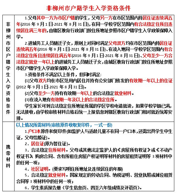 2.非柳州市区户籍学生:公办学校在接收完柳州市户籍的学区生,对符合条件的非柳州市户籍、进城务工随迁子女按政策予以录取,如公办学校学额已满,将以全日制民办中小学接收为补充的政策安排就读,家长可以根据居住地址选择学校报名。