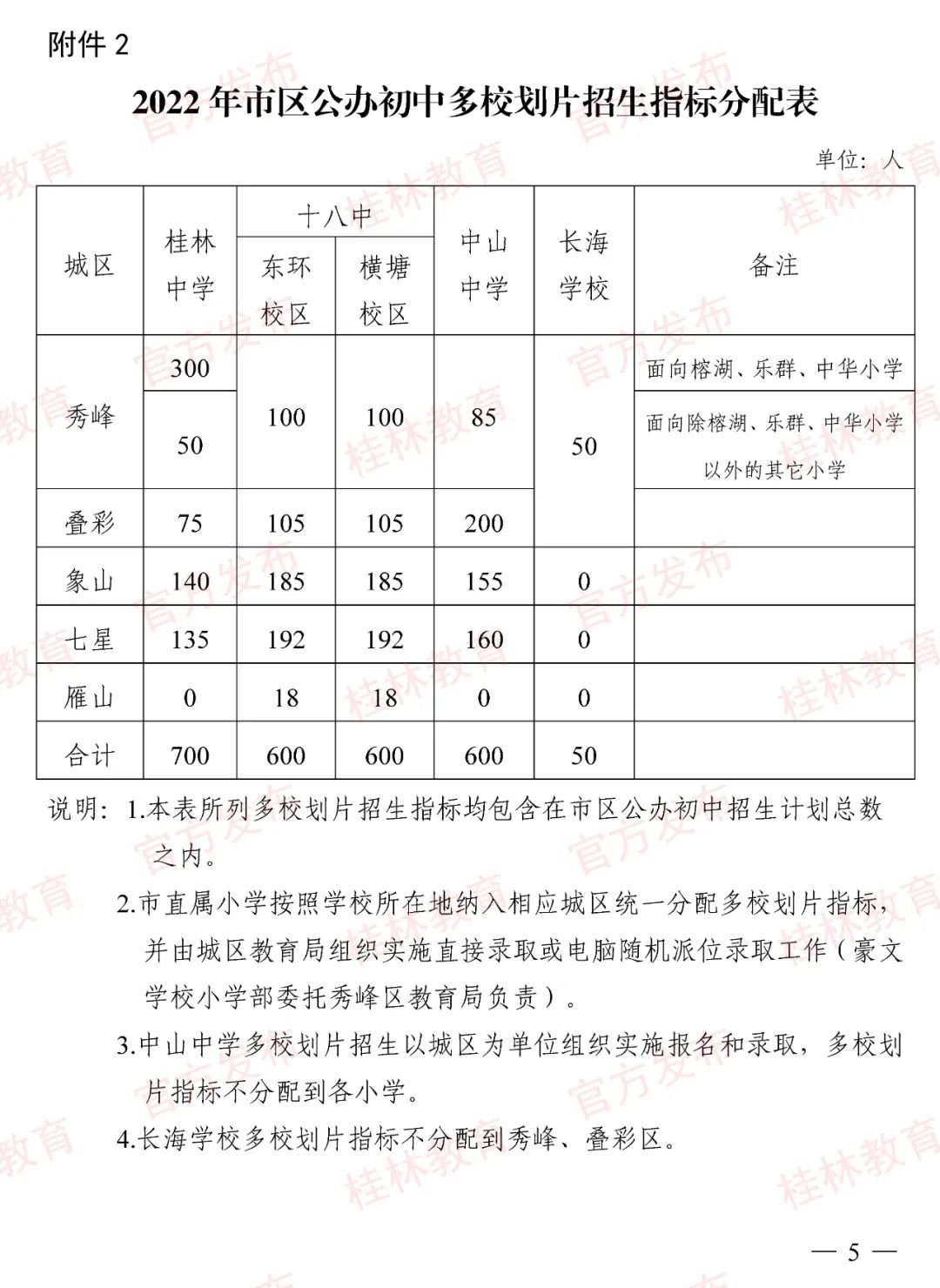 4.长海学校多校划片指标不分配到秀峰、叠彩区。