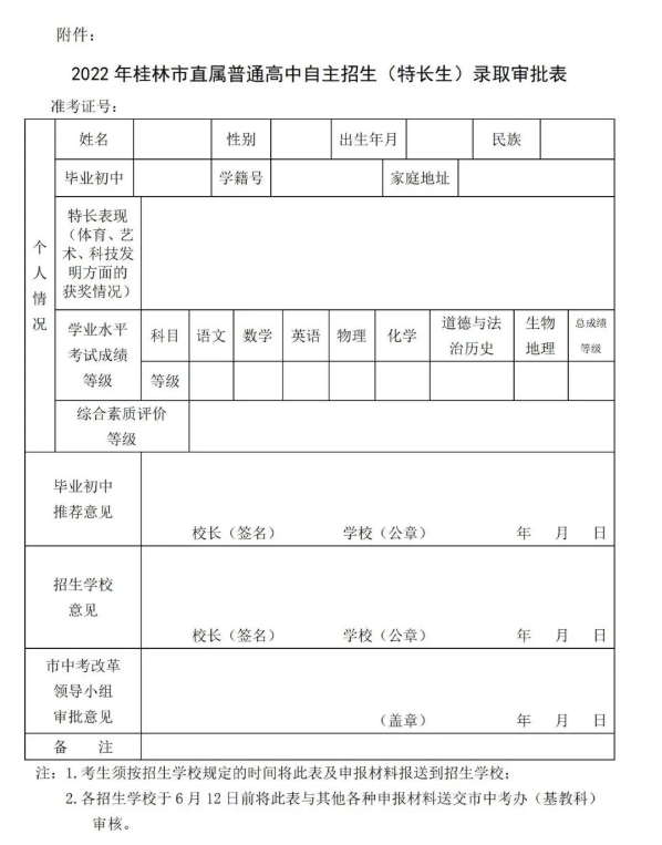 2022桂林直属普通高中自主招生特长生录取审批表下载