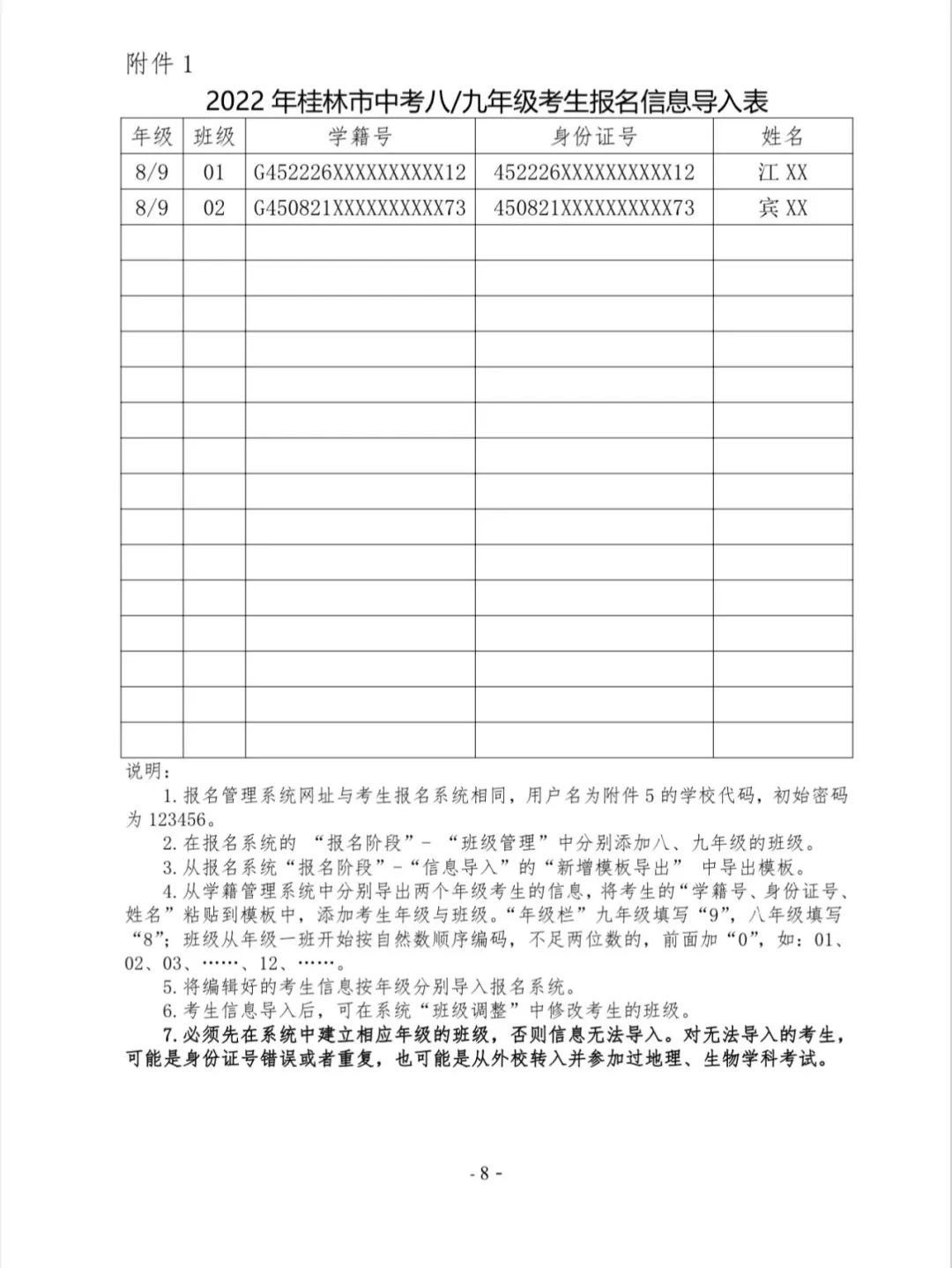 (三)上一年度已在桂林市报名参加地理、生物学科考试的九年级考生报名号不变,密码重置为其身份证号后 6位,转出或者不报名参加中考的学生信息由学校删除,县(市、区)内转入考生由学校向县(市、区)招生考试部门申请将信息调入,跨县(市、区)转入考生的信息由县(市、区)招生考试部门向市招生考试院中考科申请处理。八年级考生及上一年度没有在桂林市报名参加地理、生物学科考试的九年级考生与初中历届毕业生、同等学力者分别由学校或招生考试部门在网络报名系统中按照附件1所规定的考生信息模板与操作办法,按年级导入考生的年级、班级、学籍号、身份证号、姓名信息,生成考生的报名号与以其身份证号后 6位为初始密码的考生个人账号信息。