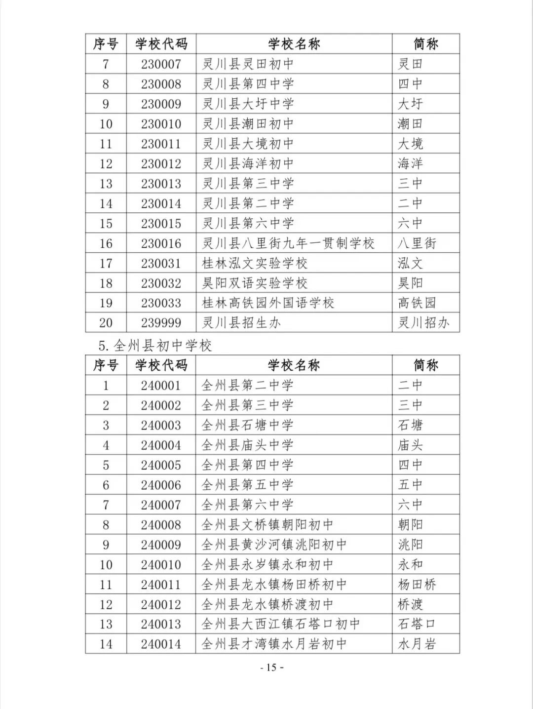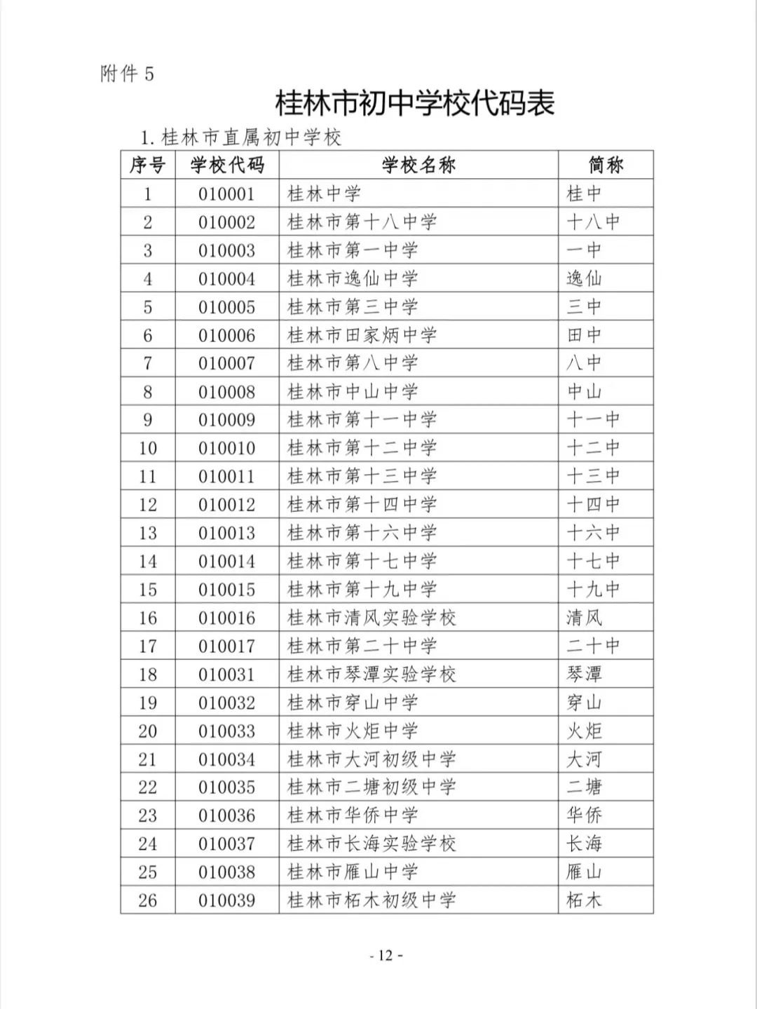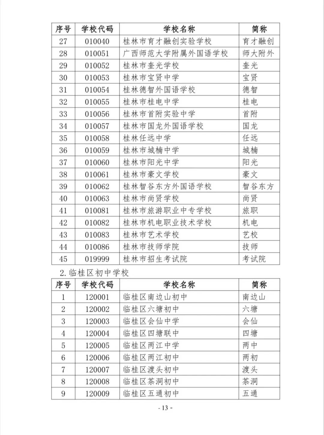 桂林市初中学校代码表