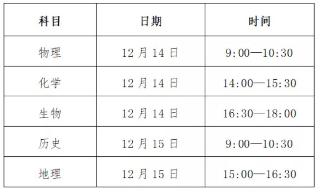 本次开考科目:物理、化学、生物、历史、地理。考试方式均为笔试,实行试卷和答题卡分离模式。考试时间安排如下: