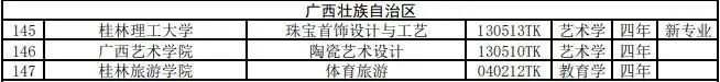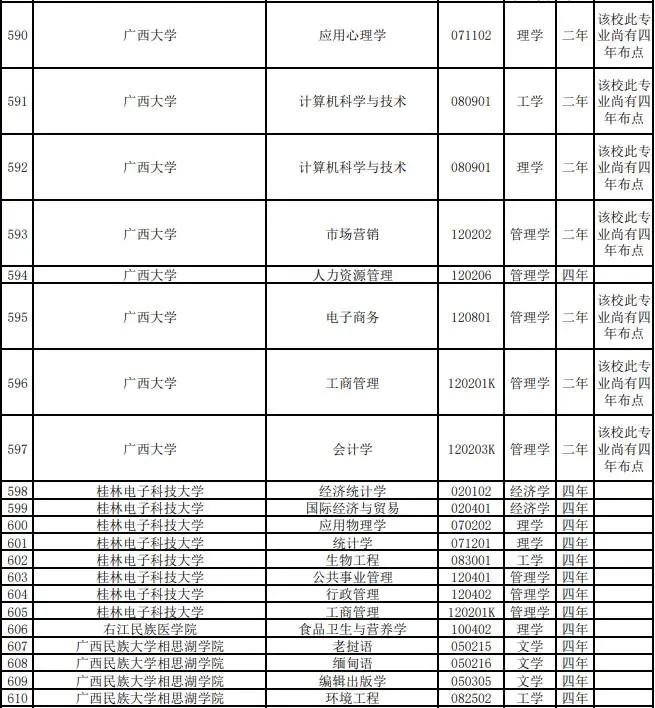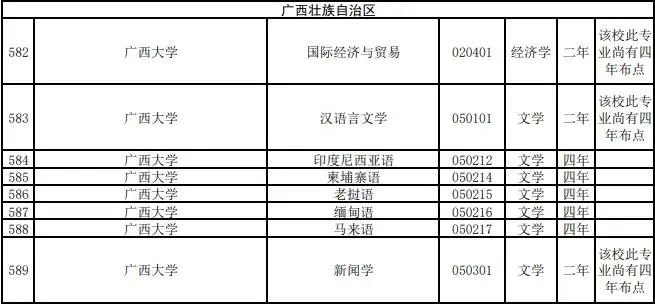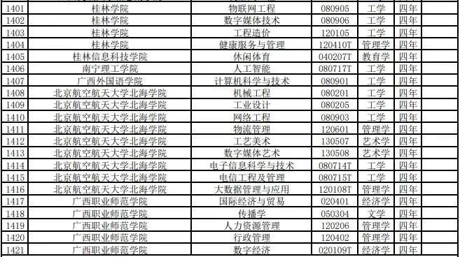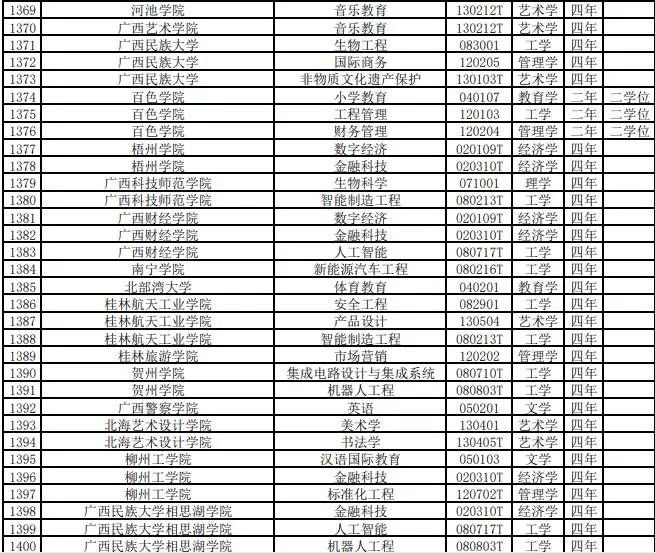 新增备案本科专业名单涉及广西28所高校的67个专业,新增审批本科专业名单涉及广西3所高校的3个专业,调整学位授予门类或修业年限专业名单涉及广西2所高校2个专业,有5所高校的31个专业被撤销。