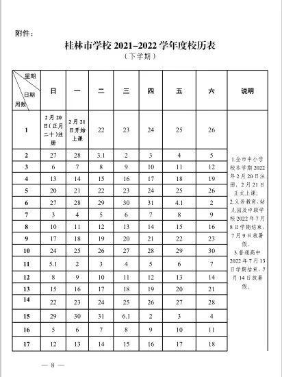 桂林市学校2021-2022学年度校历表(桂林市校历表2021-2022年第一学期)