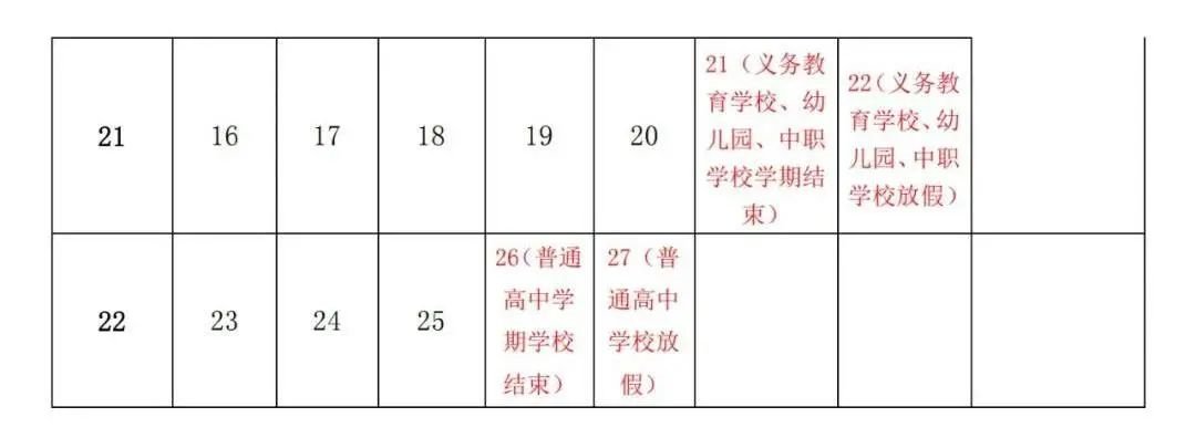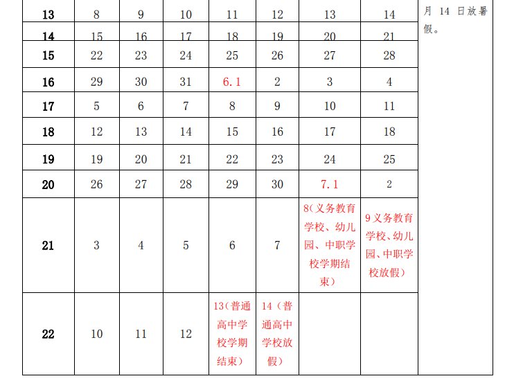 本学期全市义务教育、幼儿园及中职学校 7 月 12 日结束,7 月 13 日开始放暑假;普通高中 7 月 16 日结束,7 月 17 日开始放假。秋季学期 8 月 31 日开学注册,9 月 1 日正式上课。各校领导、行政人员 8 月 29 日开始正常上班,教师 8 月 30 日正常上班。