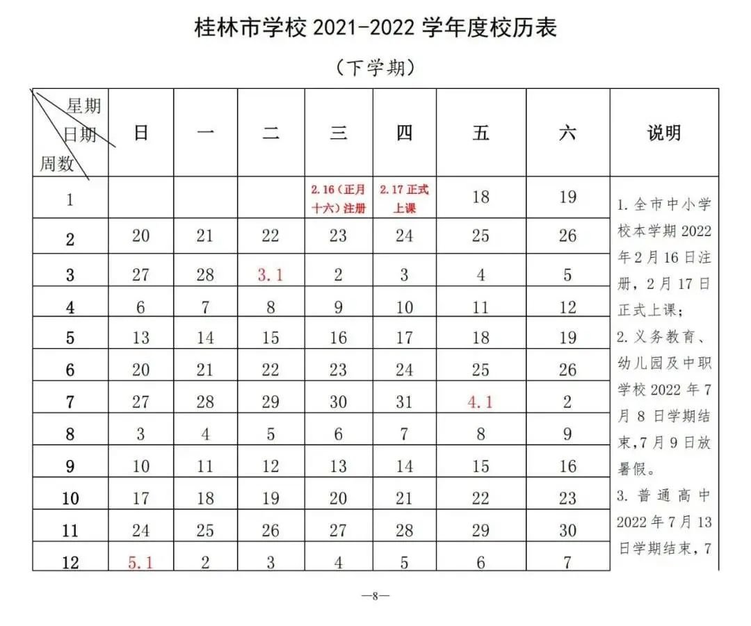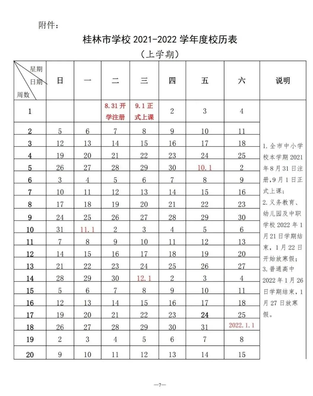 2021年桂林市中小学校历 桂林市2021~2022中小学校历