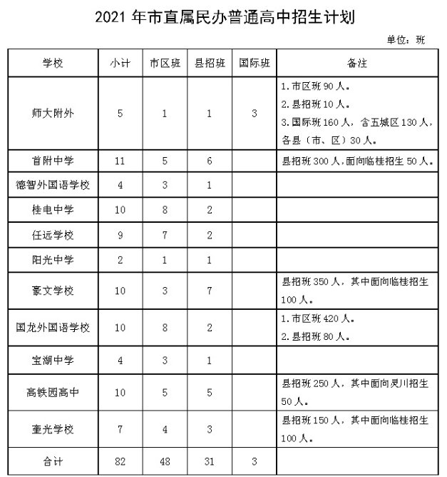 注:①巿区班面向市直属初中及五城区初中招生,县招班面向12县(市、区)初中招生。②高中班额为50人(备注栏有特别说明的除外)。③未经巿教育局批准,各学校不得擅自增加招生班薮和招生人数。