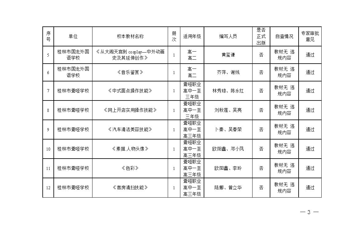 根据《自治区教育厅办公室关于做好地方课程、校本课程教材摸底调研及审核工作的通知》要求,为加强我市中小学校本课程教材管理,我局组织学科专家组对市直属学校申报的校本教材进行审核,现将审核通过名单予以公布(见附件)。从2022年春季学期起,未经审定的校本课程教材一律不得进入学校使用,请各学校严格执行。