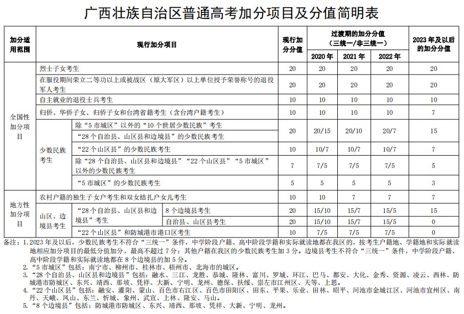 例如:A考生,少数民族考生,2019年前高中毕业,中学阶段户籍、高中阶段学籍和实际就读均在巴马瑶族自治县,2020—2022年参加普通高考,不论其在哪里补习均可以享受20分的少数民族考生加分,2023年及以后参加普通高考则享受15分的少数民族考生加分。
