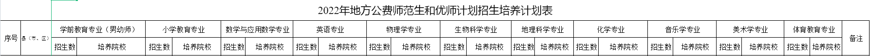 (三)招生专业为小学教育、数学与应用数学、英语、物理学、地理科学、生物科学、化学、音乐学、美术学、体育教育、学前教育,具体招生学校、计划数、定向从教县(市、区)详见《2022年地方公费师范生招生培养计划表》。招生计划纳入学校总计划统筹安排,不单列下达,计划下达后,一律不再追加,不得调整招生计划。