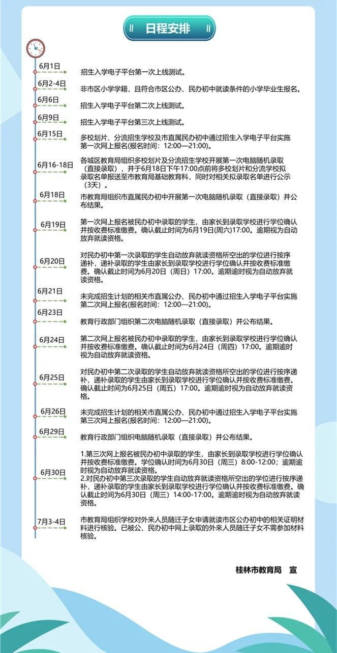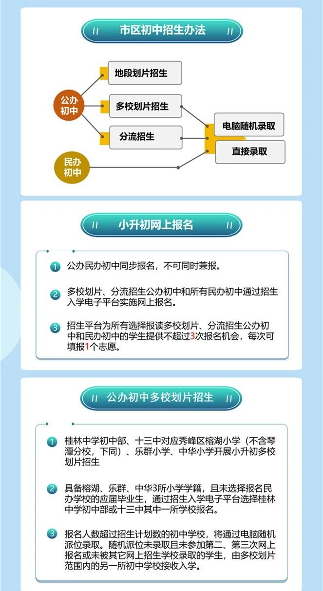 具体的招生政策看起来未免有些繁琐,桂林市教育局通过可视化的图片方式将方案内容进行了梳理,具体内容包括市区小升初招生录取流程示意图、市区初中招生办法、小升初网上报名、公办初中多校划片招生、公办初中分流招生、电脑随机派位录取说明及具体的日常安排,具体见下图: