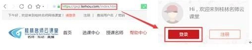 第一步:在浏览器地址栏输入网址(https://gxgl.kehou.com/index.htm),进入桂林名师云课堂,点击右侧“登录”,输入学校发的用户名、密码,点击“我的课后网”。