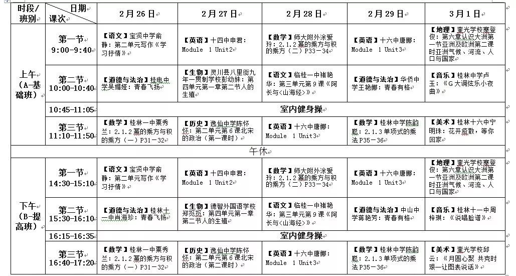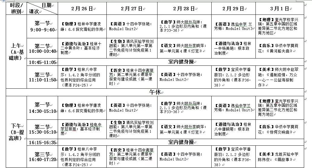 说明:语文、数学、英语三科每科基础班、提高班各 6 节,道德与法治、历史、物理、化学每科基础班、提高班各 3 节,共计 60 节。每天上、下午各安排 20 分钟的室内健身操活动时间。