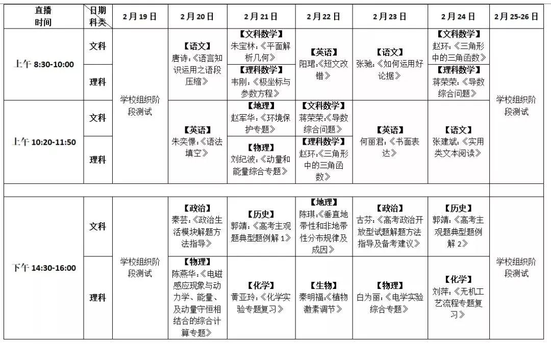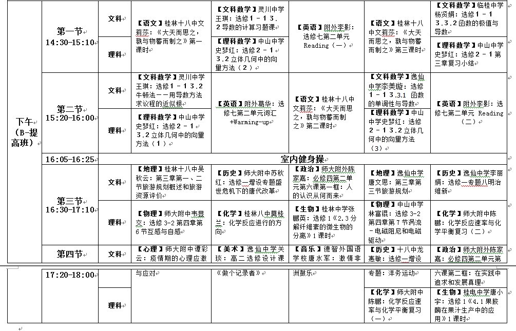 1、高二年级课程按 A、B 班分层、文理分科授课,文科、理科学生同步听课。语文、文科数学/理科数学、英语各 7 节,其中 语文、英语不分文理科,同一课次文理科学生同时收看相同课程;物理、政治各 6 节,化学、生物、地理、历史 4 科各 5 节;心理、 美术、音乐 3 科各 1 节;同一层次文、理科各安排课程 40 节,A、B 班合计开课 126 节。每天上、下午各安排 20 分钟的室内健身操活动时间。