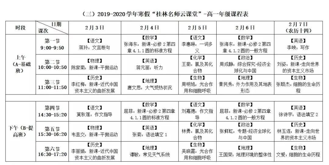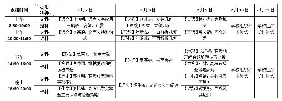 说明:本期课程不分AB班,其中,语文、英语2科不分文理科,数学分文、理,同步授课;语、数、英、理4科各安排6次课,化、政史地4科各安排5次课,生物4次课。各科每次课均为90分钟(即2个课时连堂),合计66次课(共132个课时)。