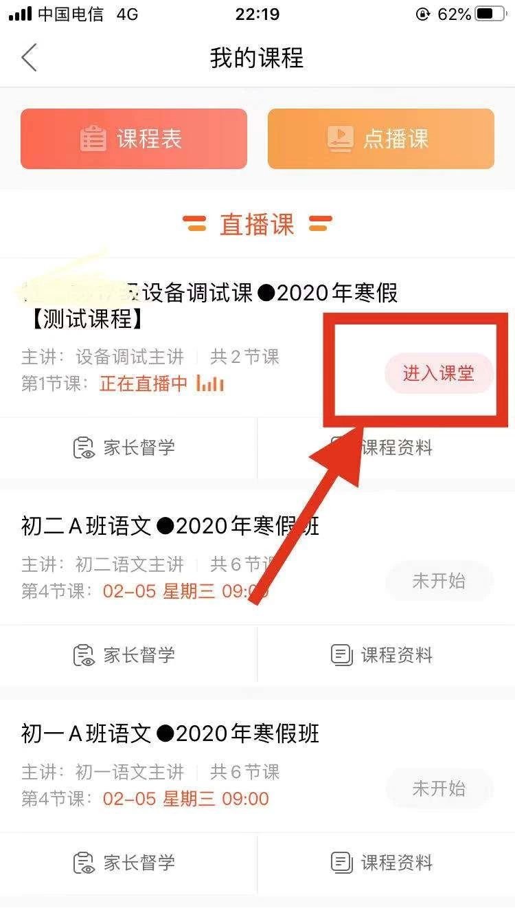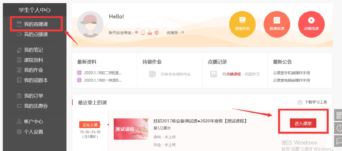 第二步:进入学生个人中心,点击“我的直播课”→点击课程右侧“进入课堂”。