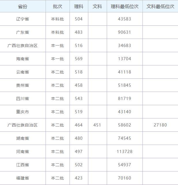 2019年右江民族医学院各省份录取分数线及录取位次