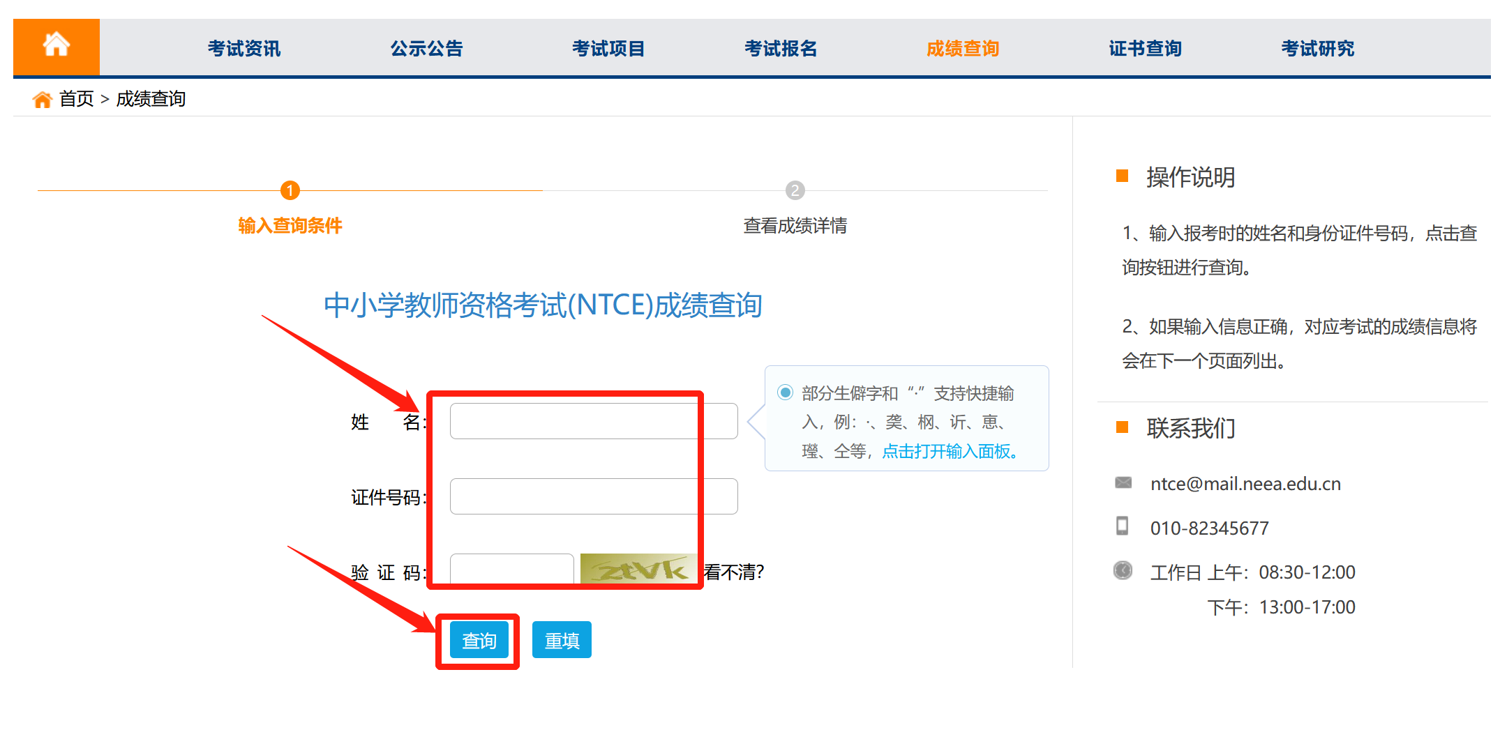 ②进入成绩查询界面后输入姓名、证件号码以及验证码,点击“查询”即可查看成绩详情。