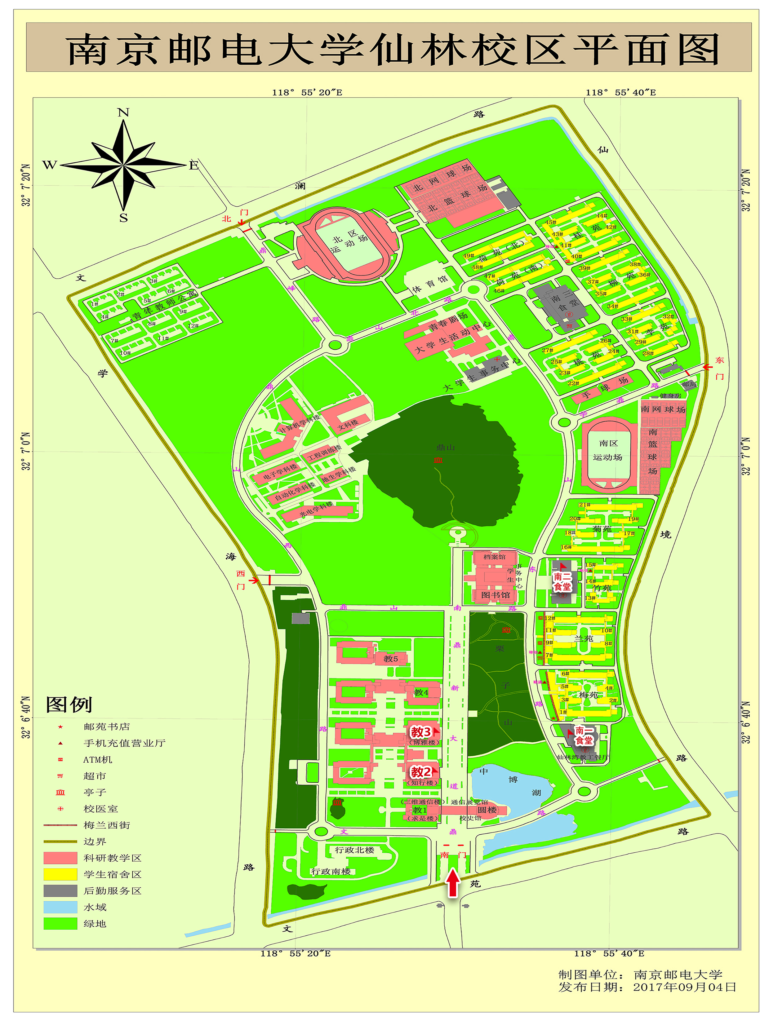 考生可查看《南京邮电大学仙林校区平面图》。同时,南京邮电大学将在官方网站公布考场分布图、各考试楼栋教室分布图供考生查阅,具体查阅时间和方式如下: