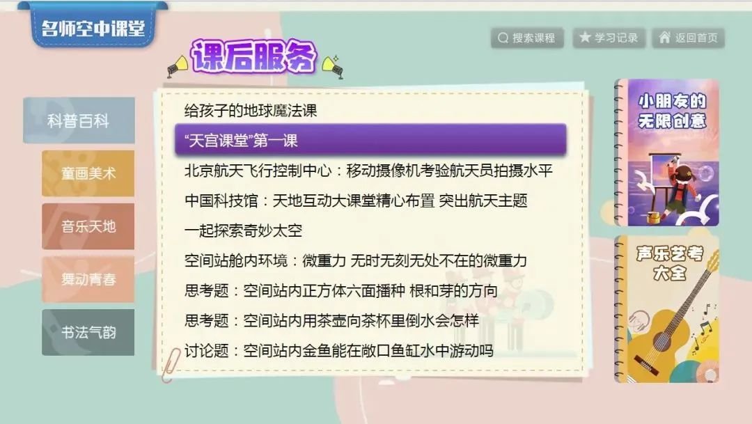 2021年12月9日“天宫课堂”进行了首次太空授课,第二课也将精彩呈现。打开江苏有线机顶盒“名师空中课堂”课后服务栏目,感受宇宙级精彩的太空实验。