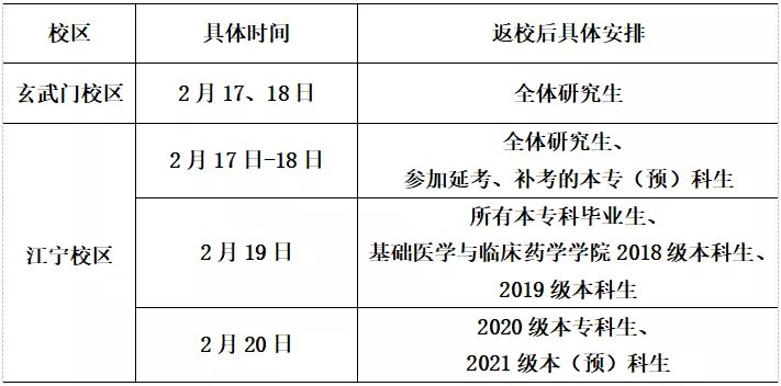 根据分期分批、错峰返校的原则,全体学生于2022年2月17日-2022年2月20日返校。具体方案见下表: