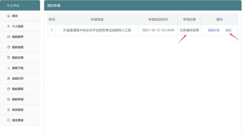 9、审核结果为“已申请未初审”时,可通过点击“撤回”中断申请流程,主要用于修改(添加、删除)科目及成绩、补充(更换)证明材料、或者放弃申请。