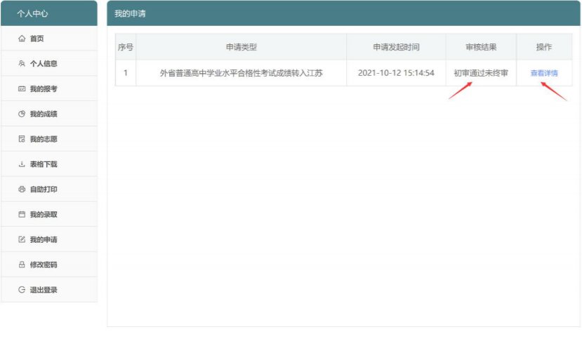 8、提交申请后可再次从“我的申请”进入“外省普通高中学业水平合格性考试成绩转入江苏”申请页面点击“点击进入”查看“审核结果”进度。